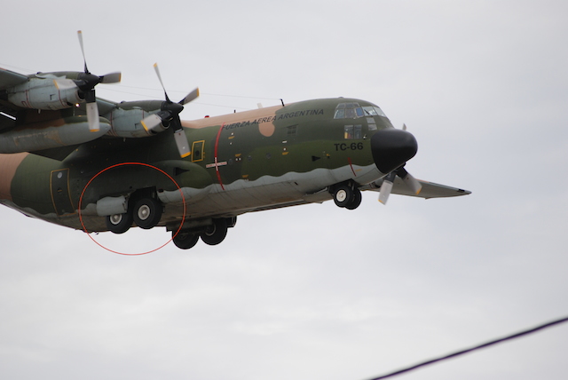 Tal como puede observarse en la foto que tomó OPI (marcada en un círculo rojo), la máquina venía con solo la mitad de una de las tapas que cierran el gabinete del tren de aterrizaje de las ruedas del lado derecho. Está claro que el elemento que observaron los chilenos se “había desprendido” en vuelo, fue parte de esta tapa, sin que hasta el momento se haya podido establecer las razones por las cuales sufrió tal deterioro.